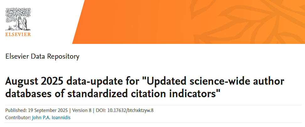 2025年9月19日,斯坦福大学与国际权威学术出版巨头爱思唯尔强强联合,正式发布“2025年全球前2%顶尖科学家榜单”(World's Top 2% Scientists)。该权威榜单由斯坦福大学John P. A. Ioannidis教授领衔的研究团队与爱思唯尔旗下数据资源库Elsevier Data Repository共同研制并推出。